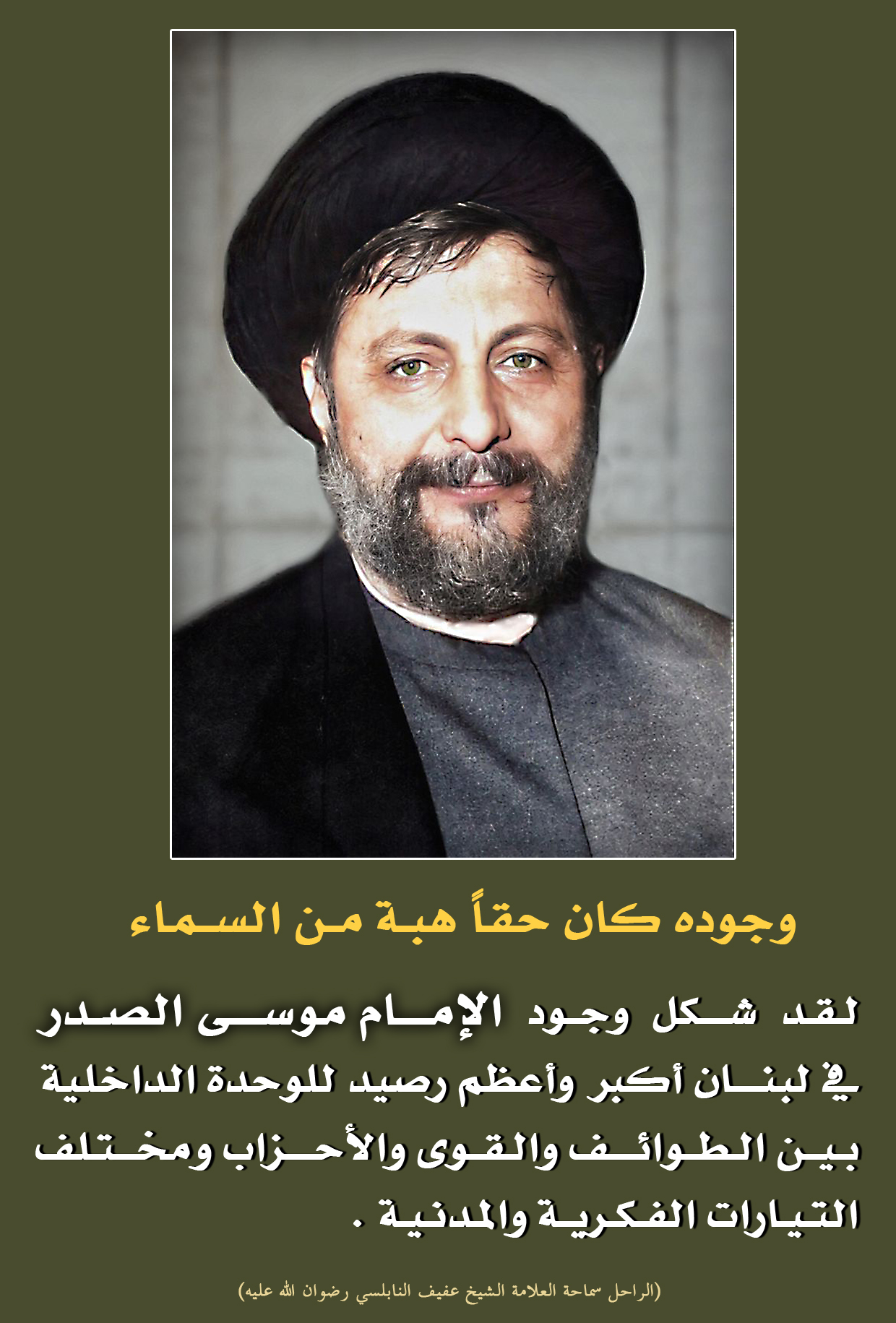 لقد شكل وجود الإمام موسى الصدر في لبنان أكبر وأعظم رصيد للوحدة الداخلية بيم الطوائف والقوى والأحزاب ومختلف التيارات الفكرية والمدنية.