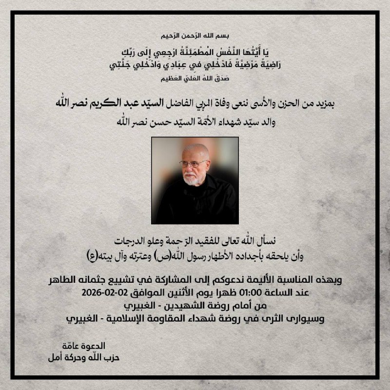 كما تُقبَل التعازي ابتداءً من الساعة العاشرة صباحًا في قاعة الإمام السيد موسى الصدر، في روضة الشهيدين – الغبيري. دعوة عامة حزب الله وحركة أمل.